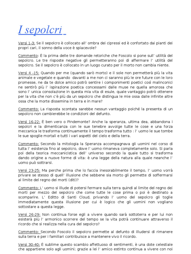 Interamente rifatta, con l'aggiunta delle epistole di ippolito pindemonte e giovanni torti, corredate di note a cura di antonio belloni. Testo della poesia con a fronte la parafrasi e approfondimento figure retoriche. Nei sepolcri la concezione materialistica e pessimistica dell'universo espressa nell'ortis viene ribadita. All'ombra de' cipressi e dentro l'urne confortate di pianto è forse il sonno della morte men duro? Non vedo le rocce spaccarsi, né i sepolcri aprirsi.